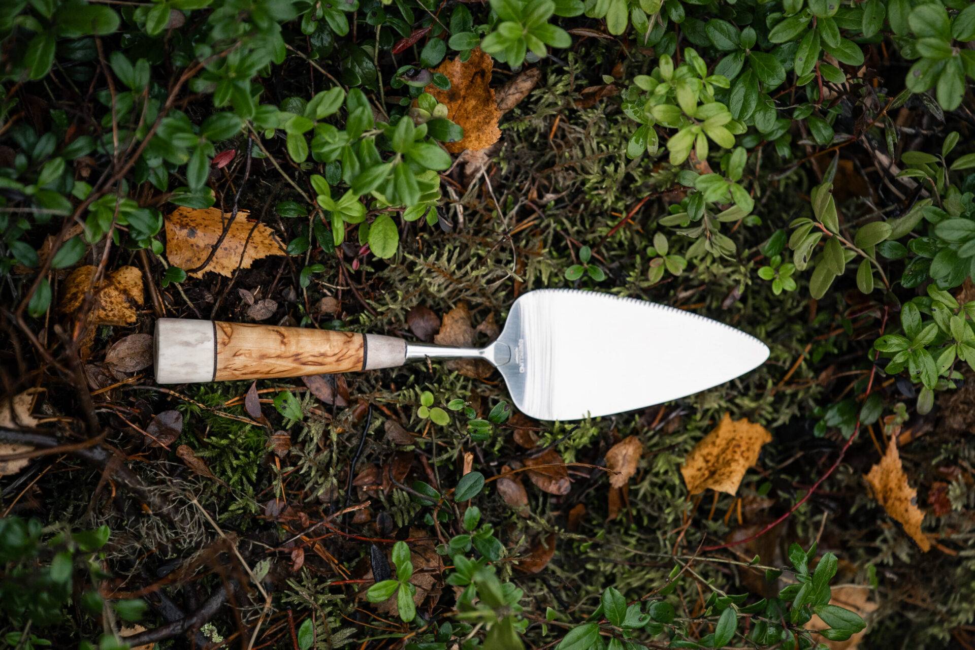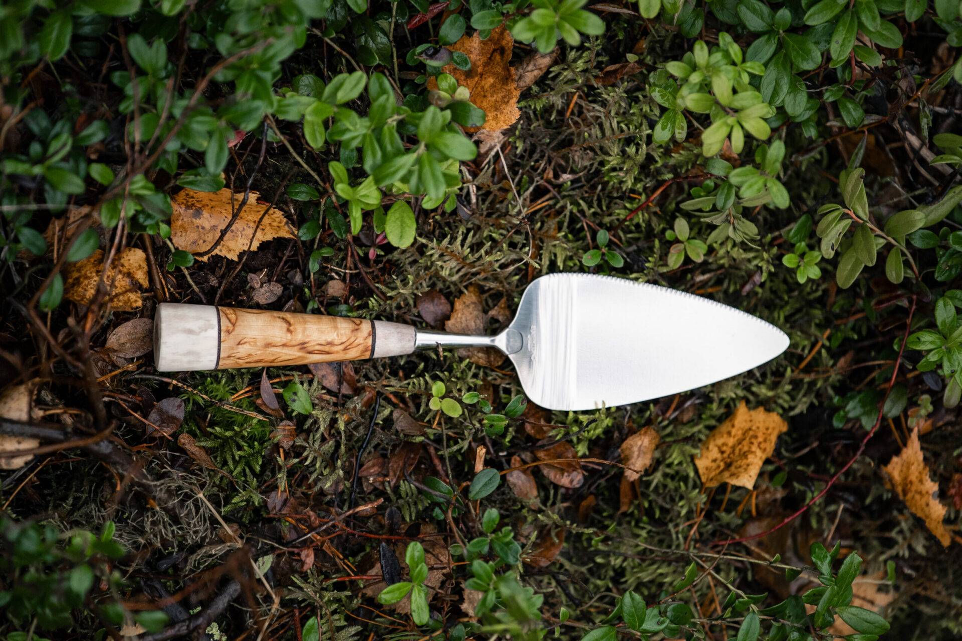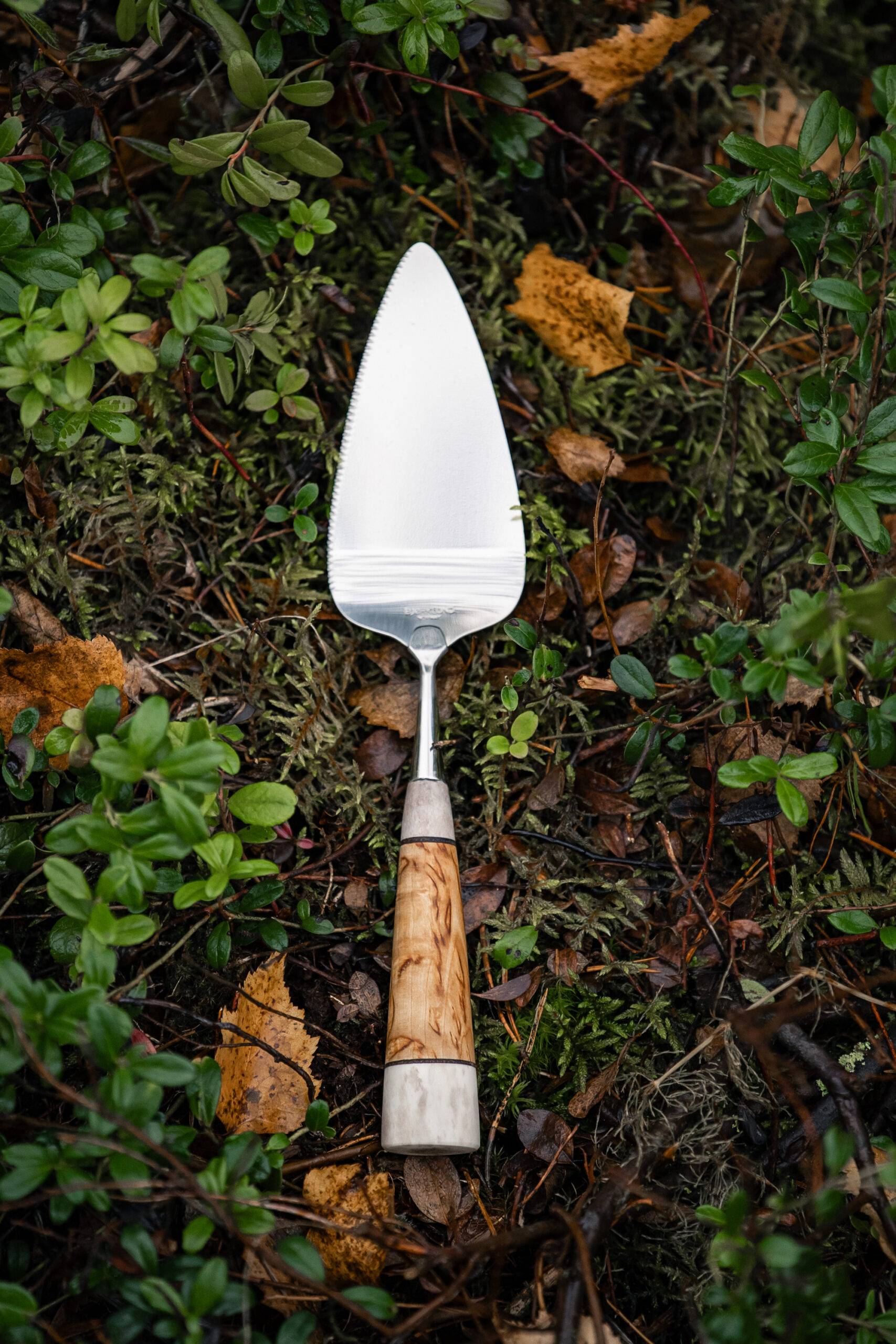 Cake servermade of reindeer antler and curly birch and stainless steel.